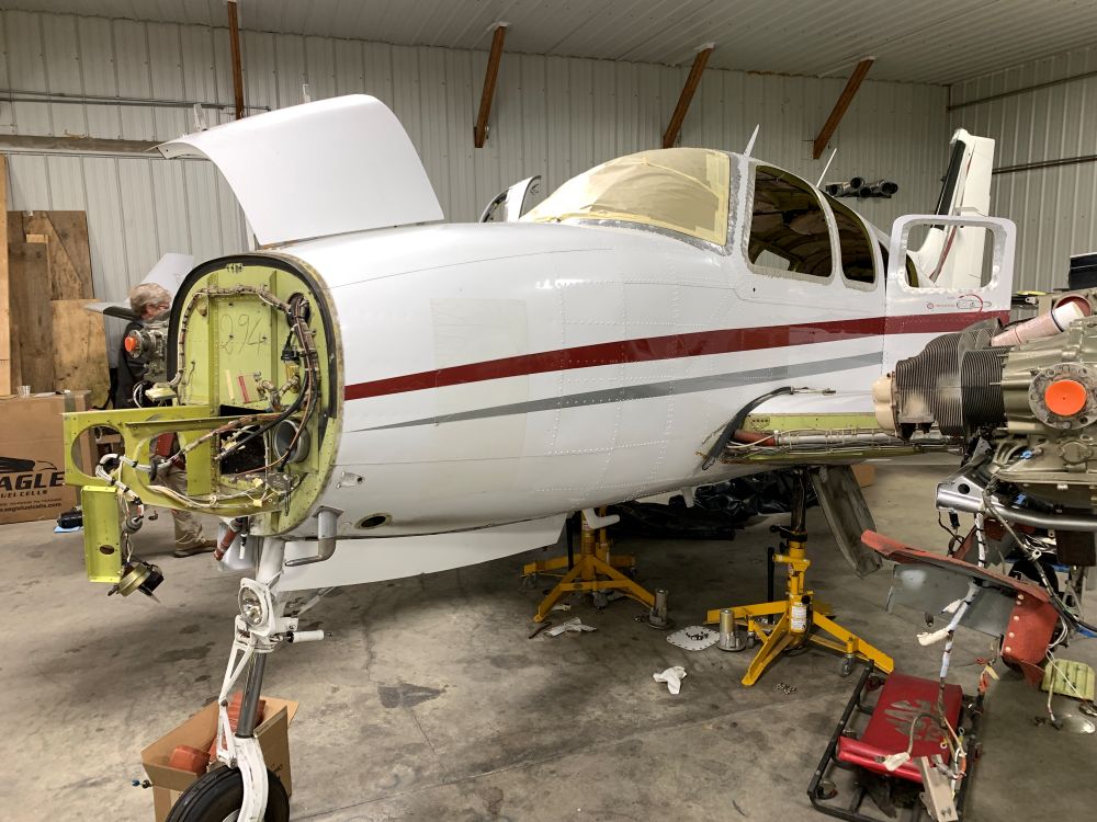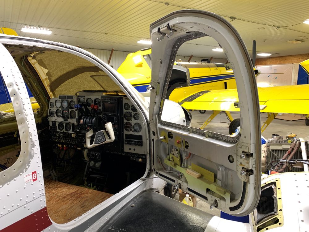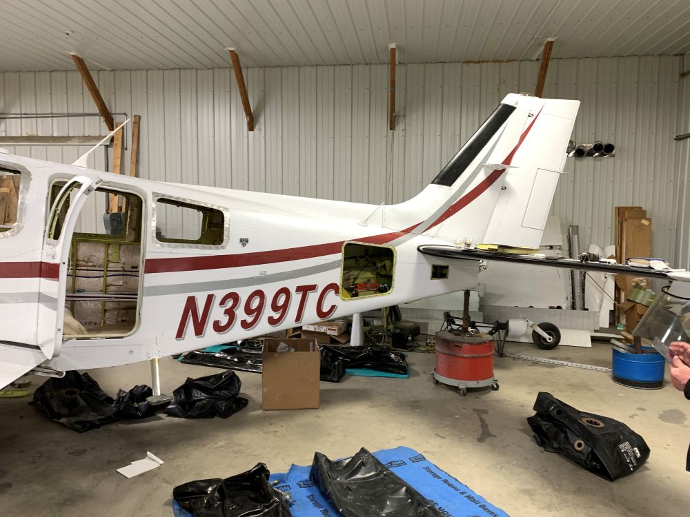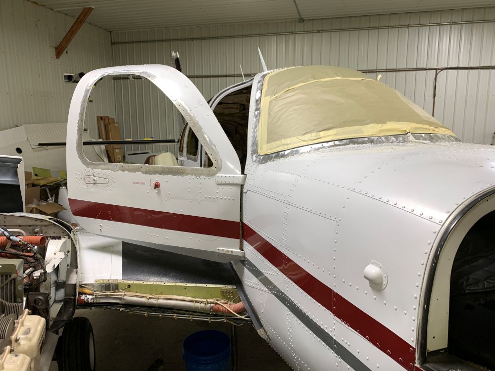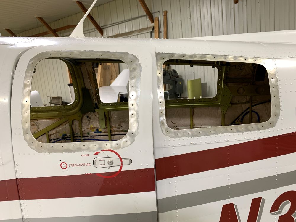 Paint is stripped around the windshield and each window, then side windows are removed. Cabin floor is inspected and cleaned, and fuel cells are replaced.