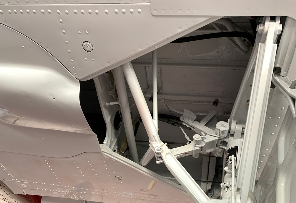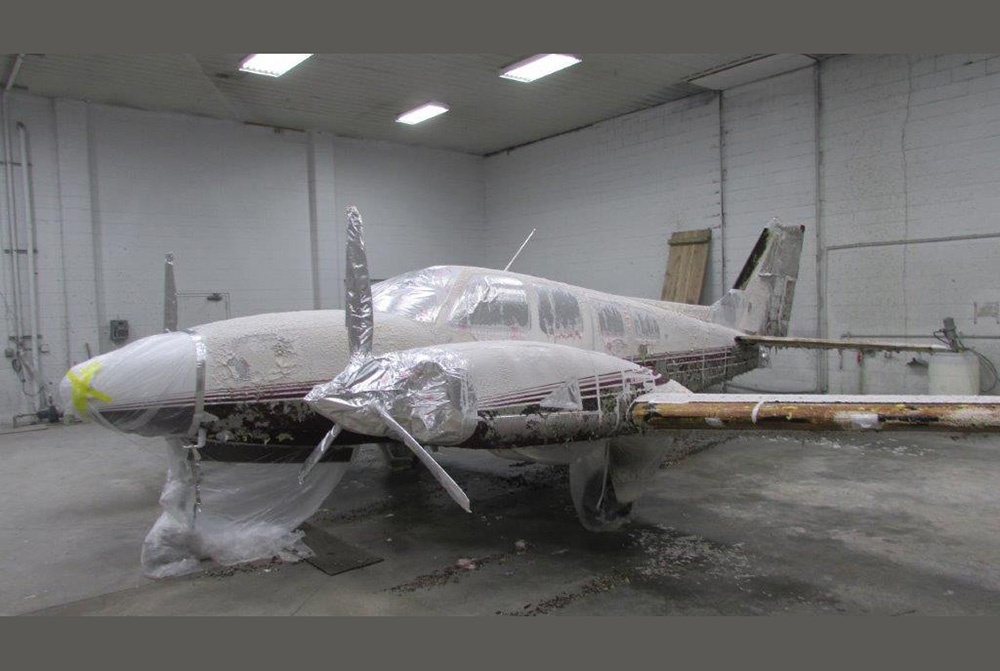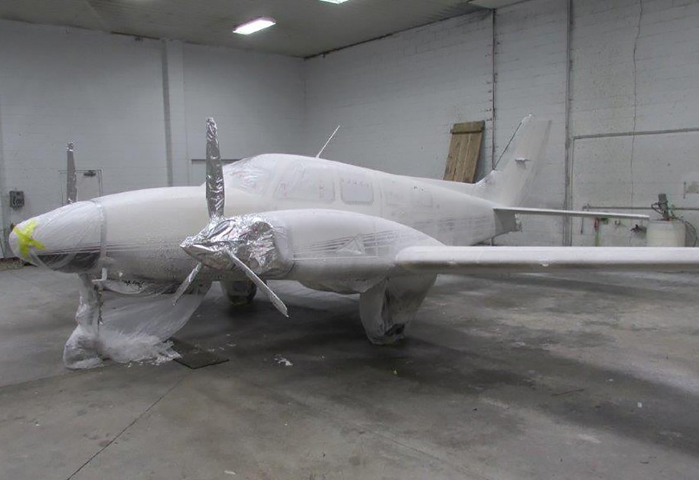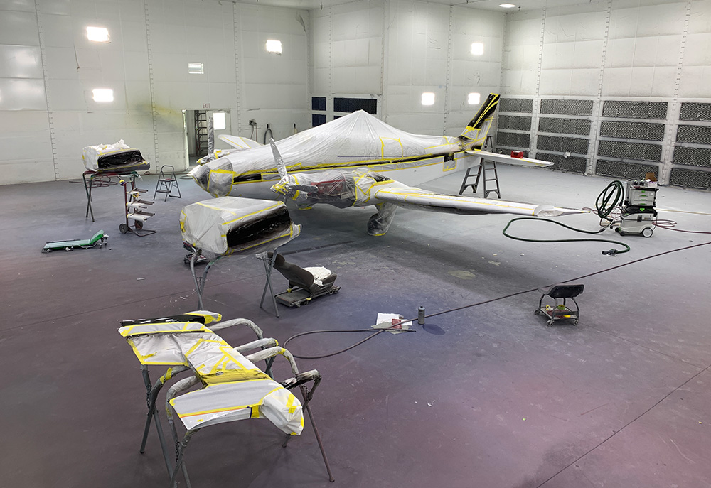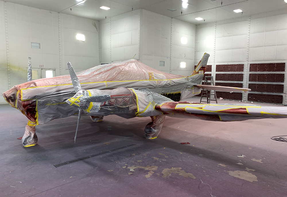 The old paint is stripped off the airframe and any minor repairs to the metal surface are completed. Alodine and green sealer are then applied for corrosion protection and to improve paint adhesion.